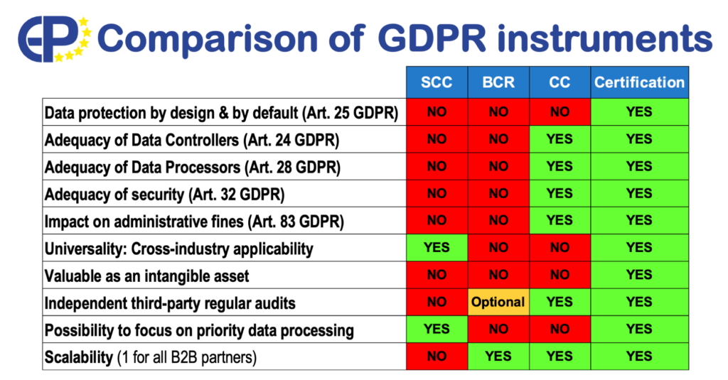 ✅ 𝐀𝐯𝐚𝐢𝐥𝐚𝐛𝐢𝐥𝐢𝐭𝐲 𝐚𝐧𝐝 𝐞𝐟𝐟𝐨𝐫𝐭: Approved certification schemes such as Europrivacy and SCCs are ready to use. By contrast, Codes of Conduct and BCRs may require years of preparation and approval, and BCRs are limited to entities within the same company group.